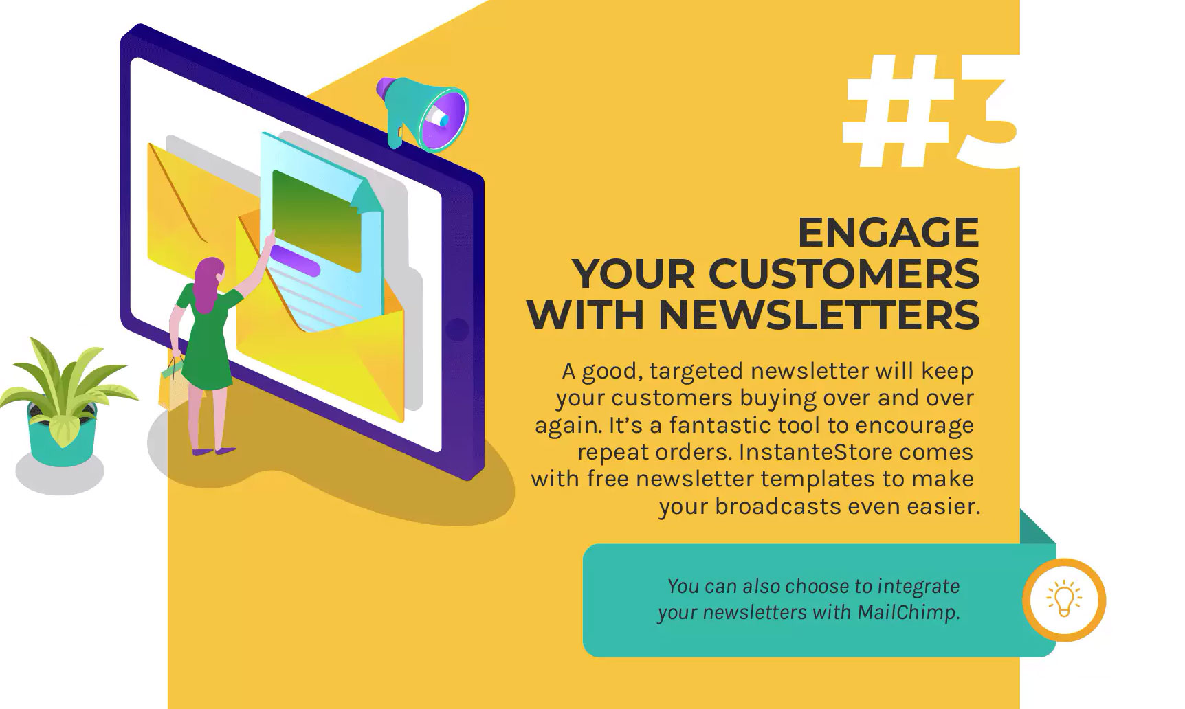 Newsletters are a powerful tool in your ecommerce marketing arsenal, ideal for driving customer loyalty and repeat business. They help maintain a strong relationship with your customers, encouraging repeat purchases. InstanteStore comes with free newsletter templates to make your broadcasts easier. You can also choose to integrate your newsletters with MailChimp, a popular email marketing service, for even greater reach and engagement.